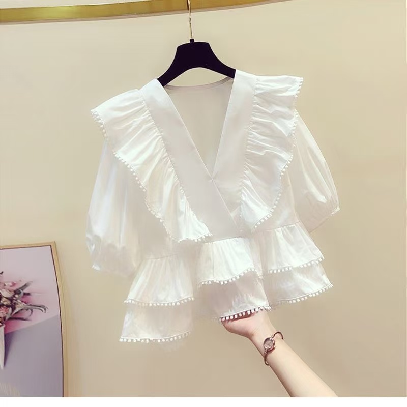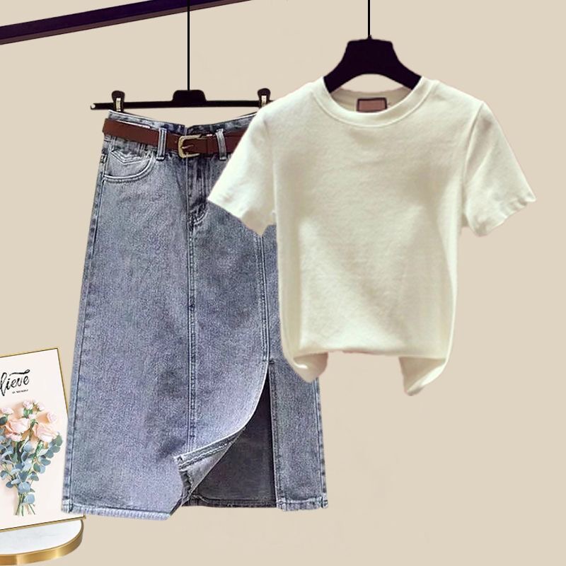 New summer fashion ruffled top shirt slit denim skirt age-reducing skirt slim two-piece suit