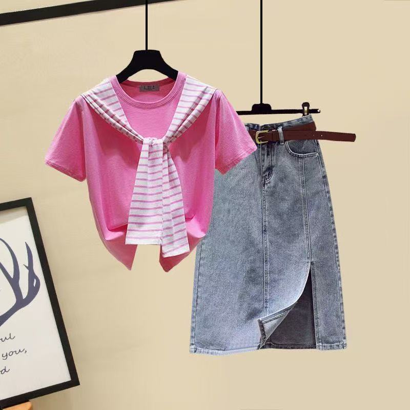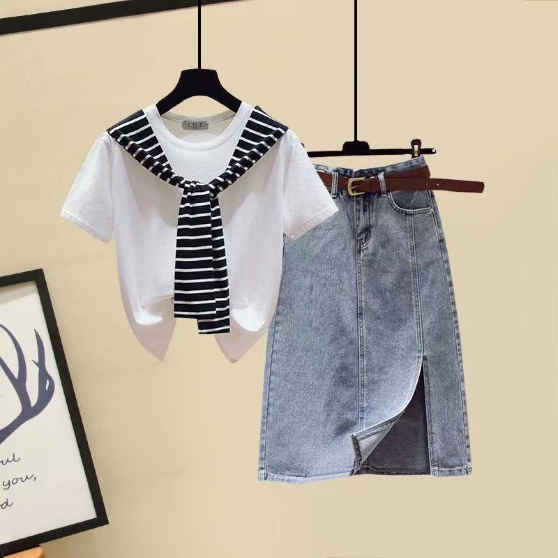 Women's summer new shirt suit literary casual shawl shirt denim slit skirt two-piece suit